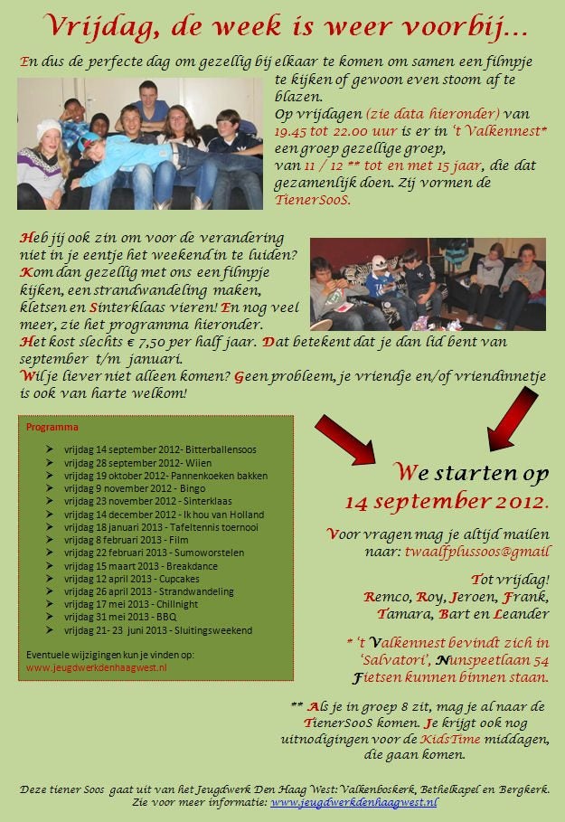 www.jeugdwerkdenhaagwest.nl TeenTime avond voor tieners vanaf groep 8 t/m 14 jaar. Op vrijdagavonden in ’t Valkennest in Bethel. Contact via app-groep. Aanmelden: info@jeugdwerkdenhaagwest.nl